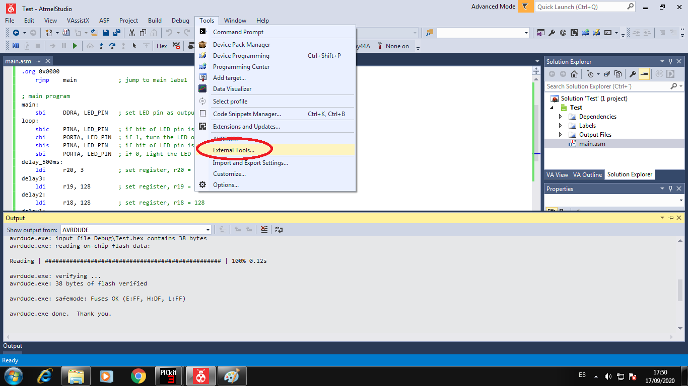 To use the USPtiny programmer we configurate in the menu Tools -> External Tools: