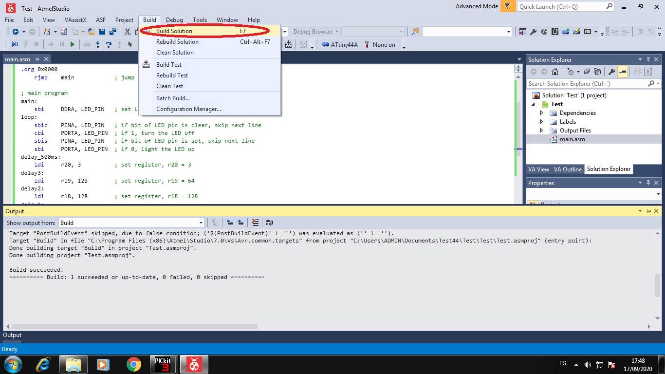 In the menu choose Compile -> Build to compile and build the HEX file: