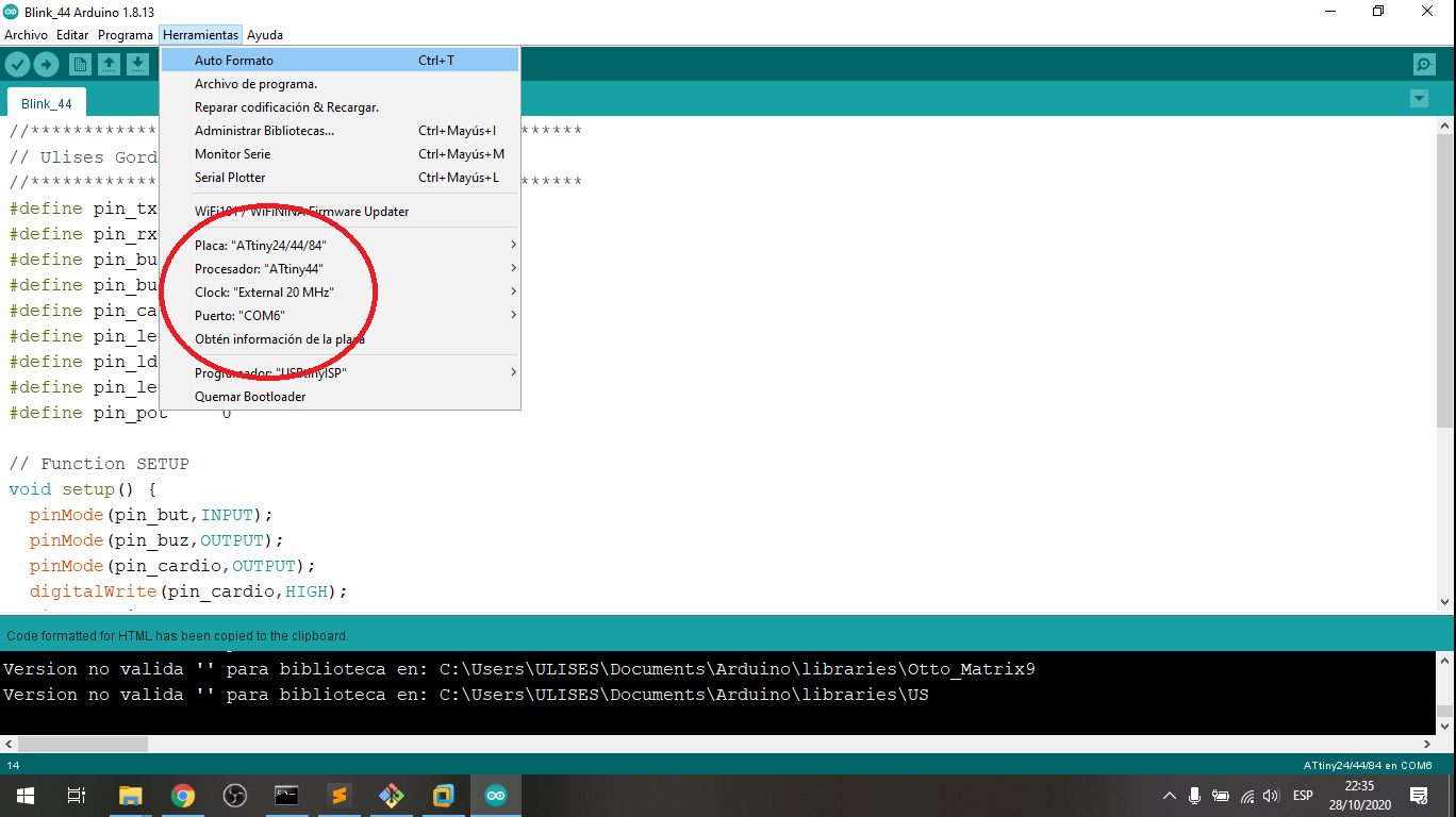 To program in Arduino IDE the Attiny44 microcontroller, we must have the Attiny Compiler added in Arduino IDE0, and then we can learn the number pins: