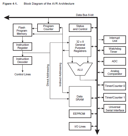 We can see the connection of: - Flash Program Memory - Instruction Register - Instruction DEcoder - ALU - Data SRAM - Register - Internal Resources