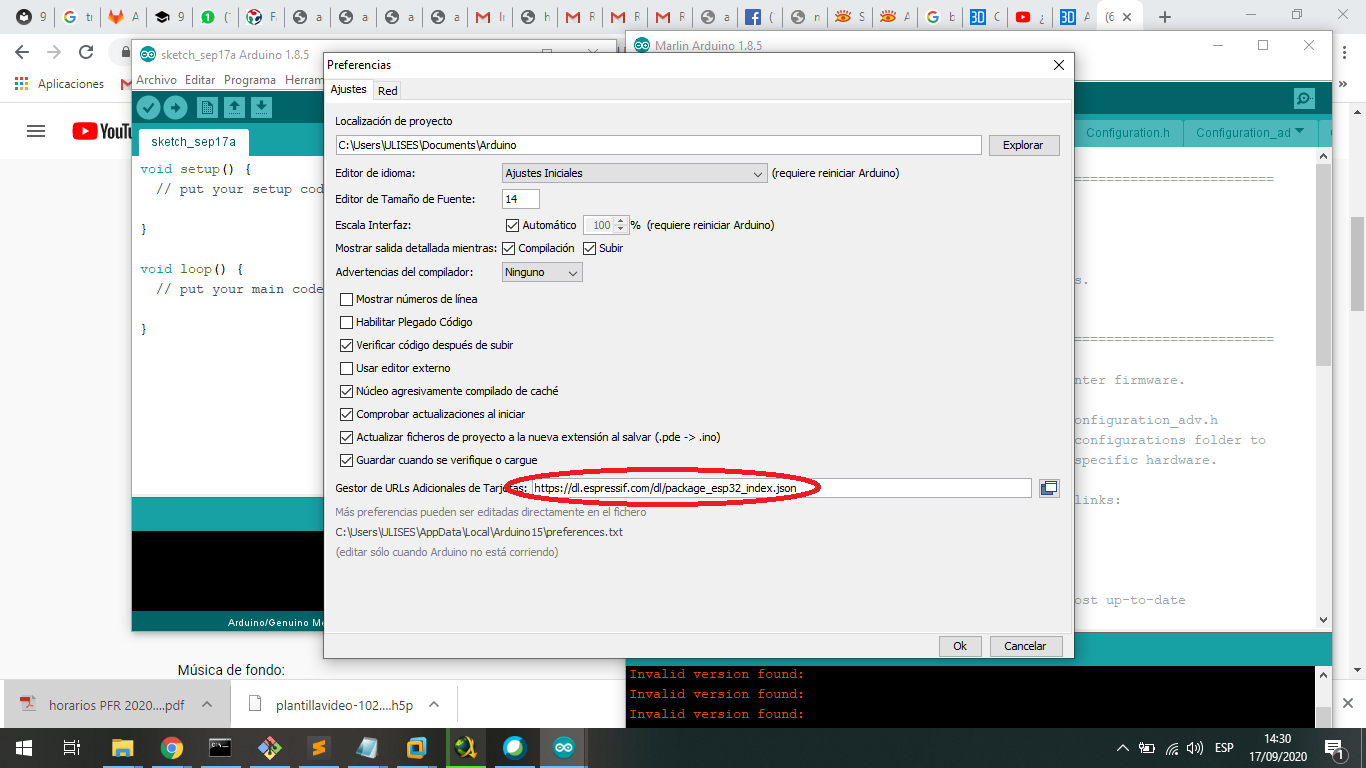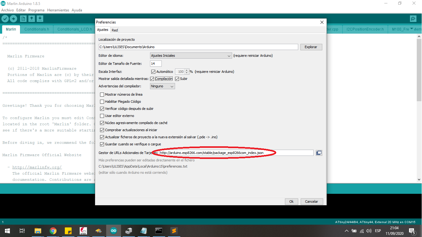 First I download the libraries to Arduino IDE from the Development page, it is https://dl.espressif.com/dl/package_esp32_index.json, I copy and paste in Preferences in Arduino Menu: