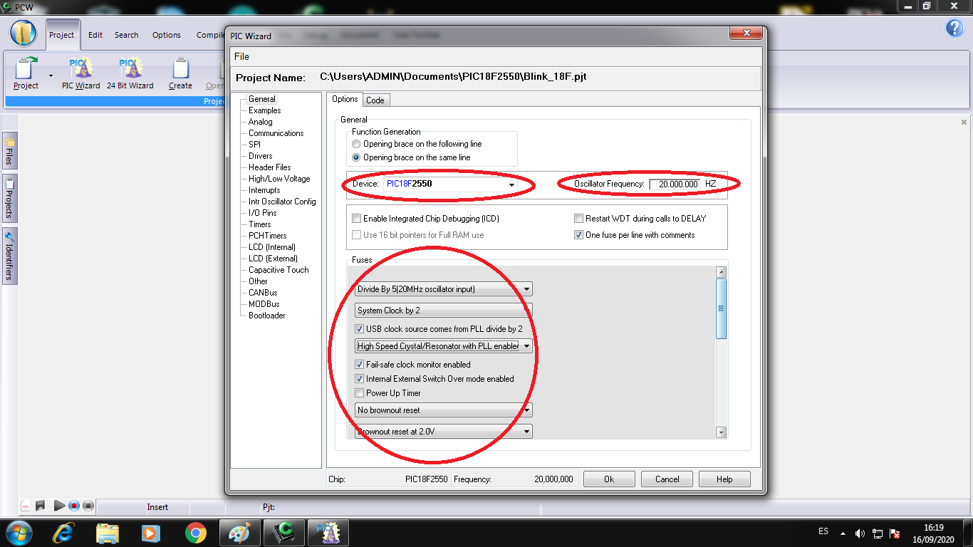 Choose the microcontroller PIC18F2550, the word frecuency to 20MHz and configuration the word bits: