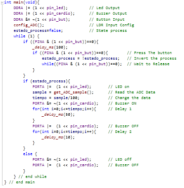 - The LDR signal control the frecuency to Buzzer, faster when the light is greater, and slowest when the light is less