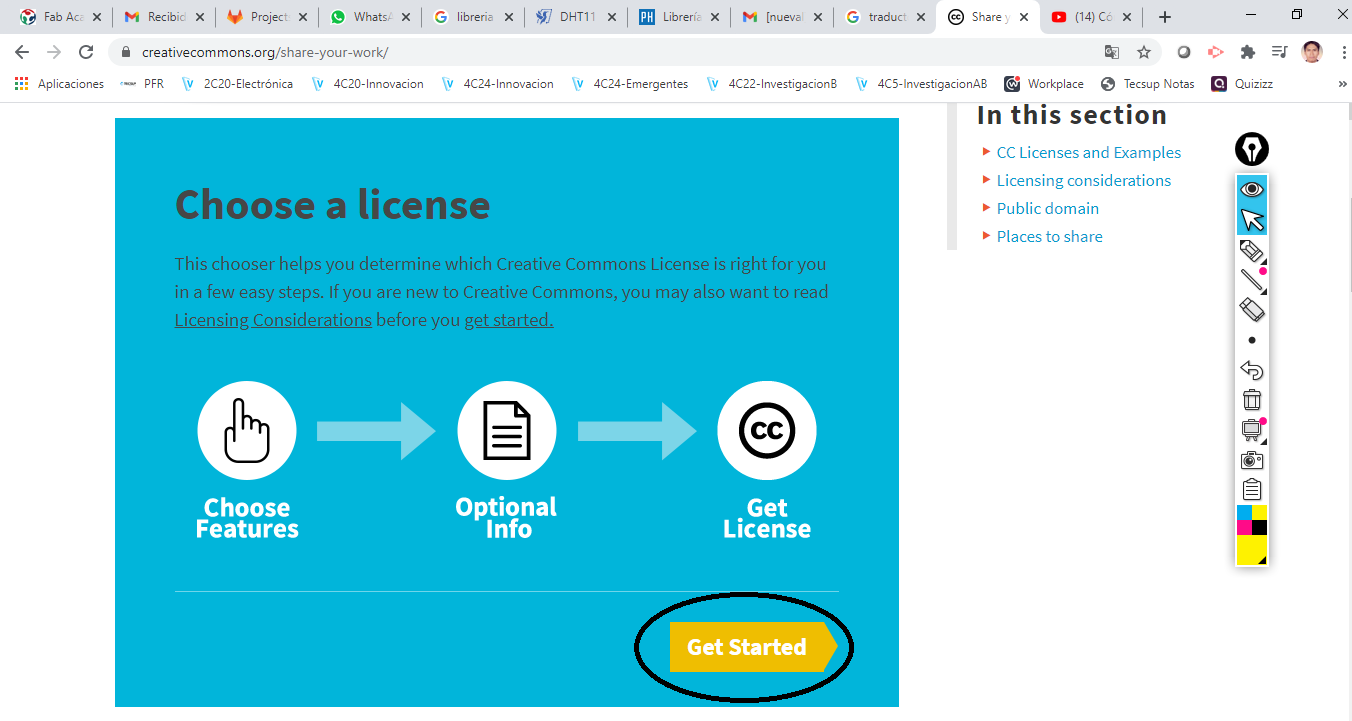 Then we look for the section of Choose a License and we click on _Get Started__