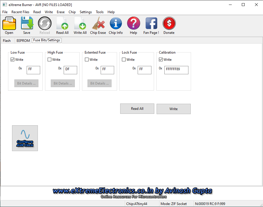 To configure the microcontroller configuration bit fuses for a 20MHz crystal, record with the following combination.This recording is done with the USBASP recorder and the eXtreme Burner software.