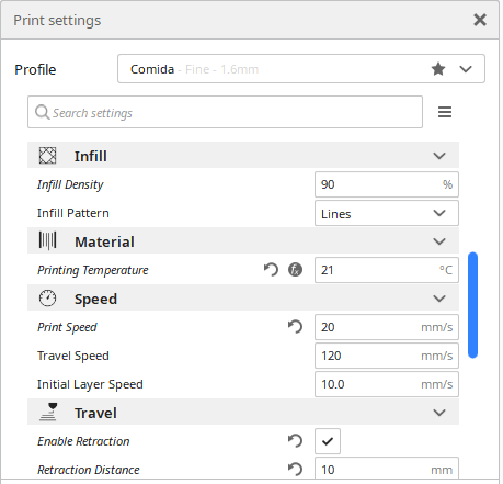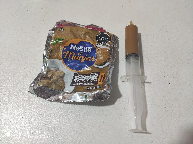 Chocolate Delicacy: For the printing with chocolate delicacy, a commercial one was used, it turns out that it has the ideal viscosity for 3D printing