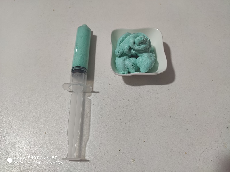 For the material injection work we use an extruder that pushes the cold material through a syringe.
