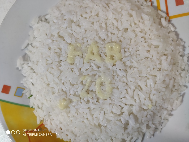 - On the rice, we make a flattening with a container so that we achieve the largest flat surface.