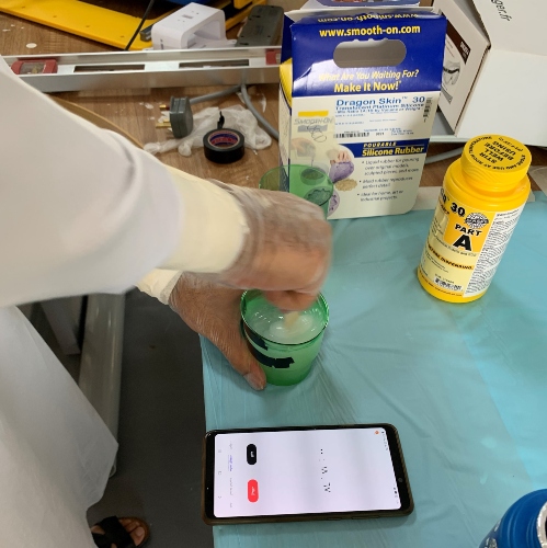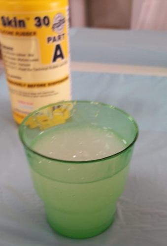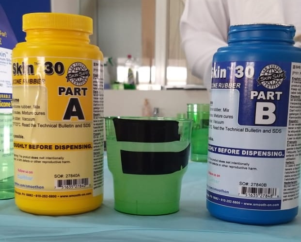 I filled the Part A silicone until the start of the first black tape and then I continued by pouring the Part B of silicone in the same cup until it reached the start of the second black tape. The ratio of the silicone mixture is 1:1 of each part.