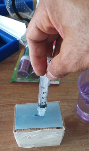 Now I am measuring the amount of water I can put in the mold so I can later add the resin. The amount of water I can put in the mold is 30 ml.
