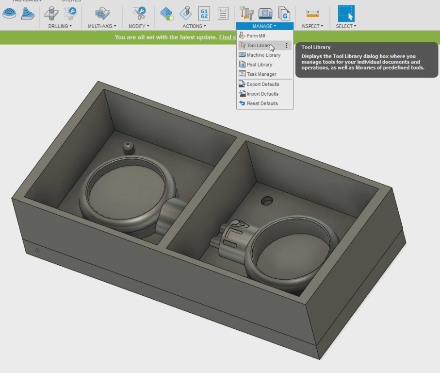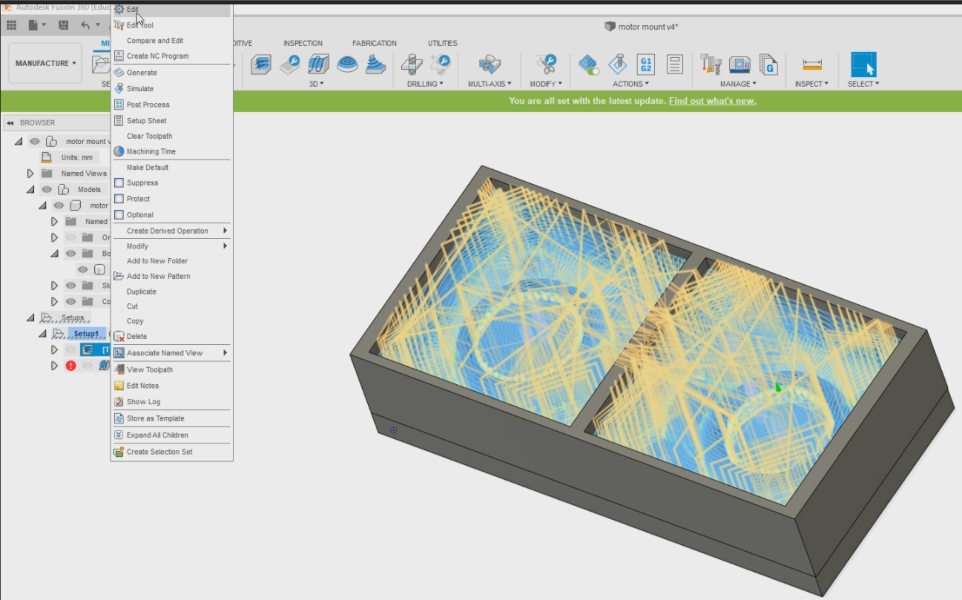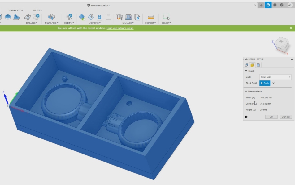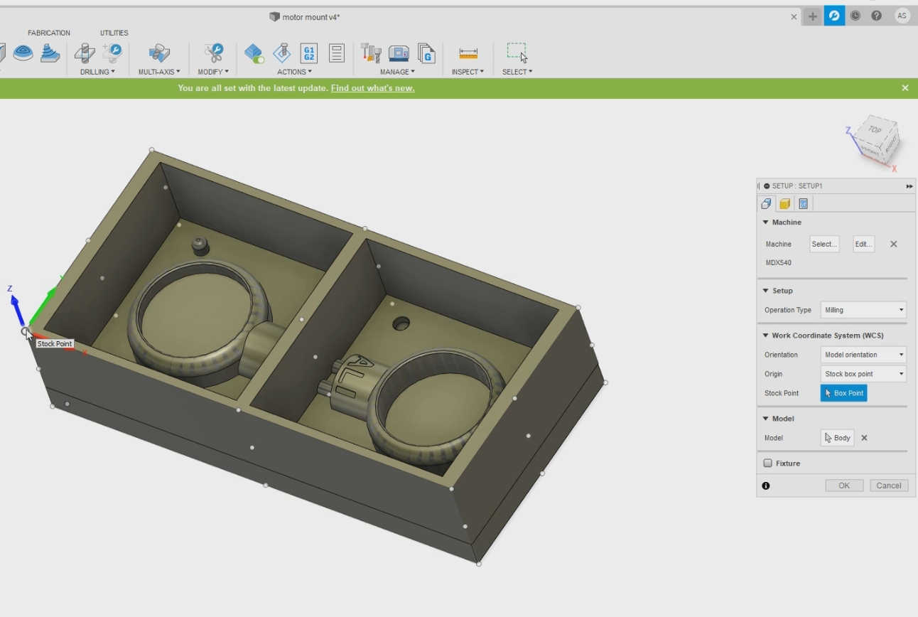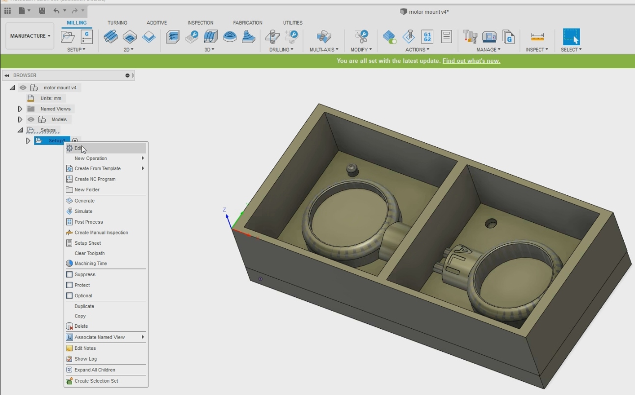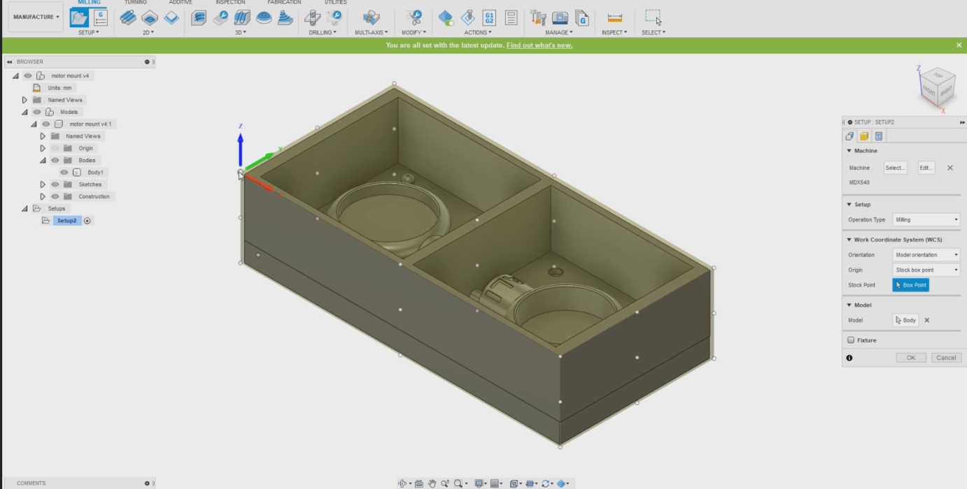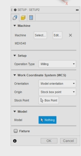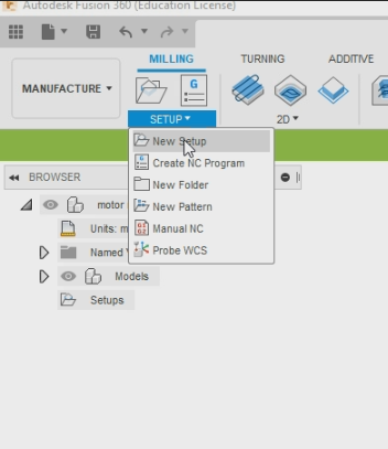 I opened Fusion 360 and clicked on “Setup” then “New Setup” which is under the “Milling” section.