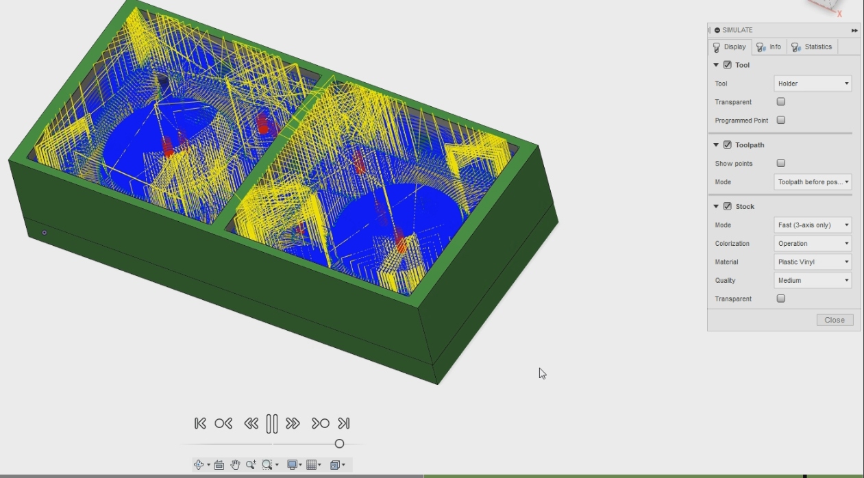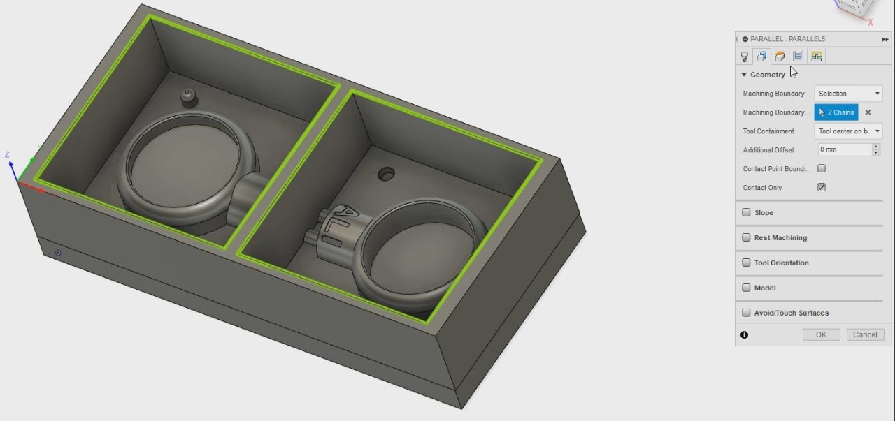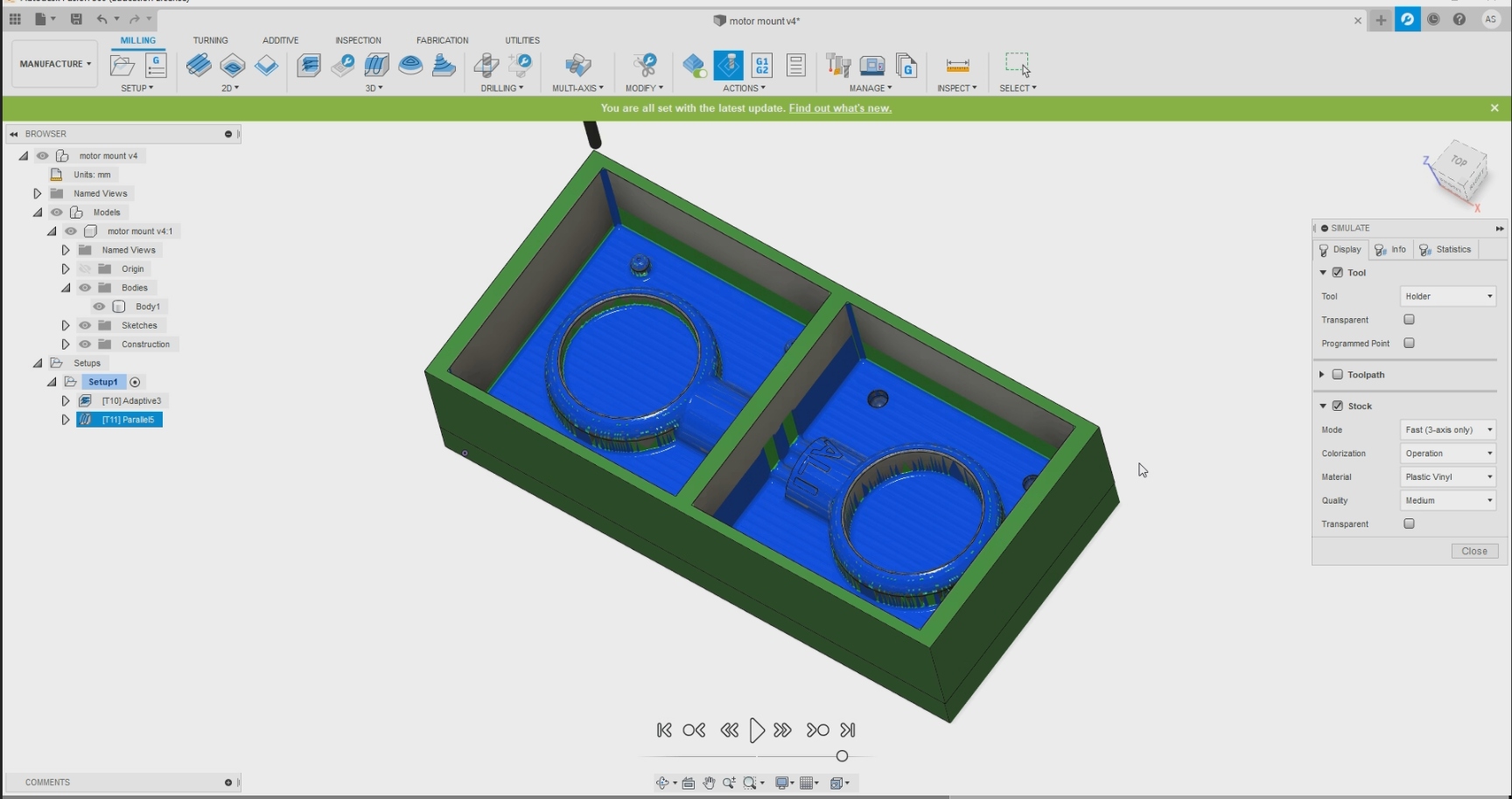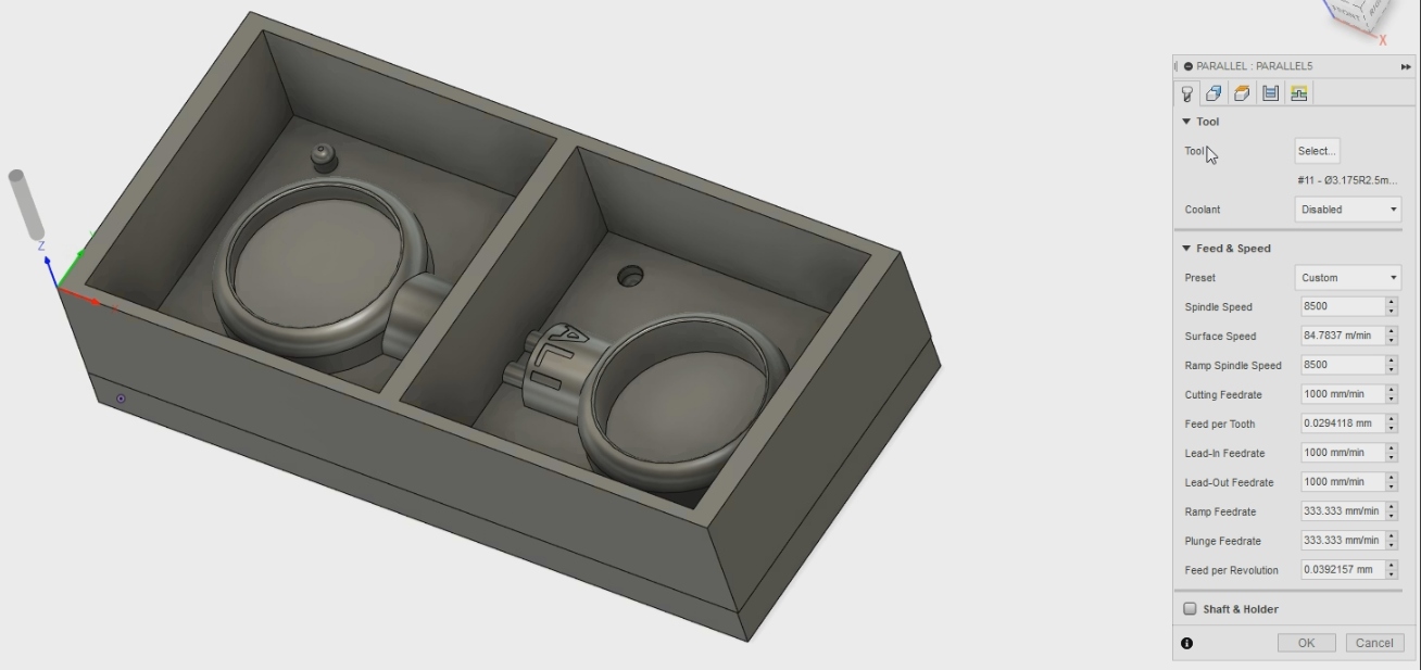 The video shows how the tools will start milling the mold in 2 parts one with the “Adaptive” file and the second with the “Parallel” file.