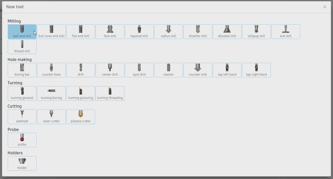 Then I clicked on “Ball End Mill” under the Milling sections.