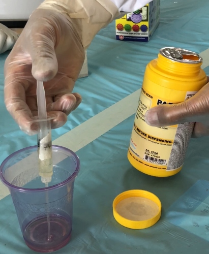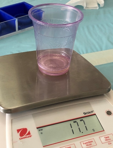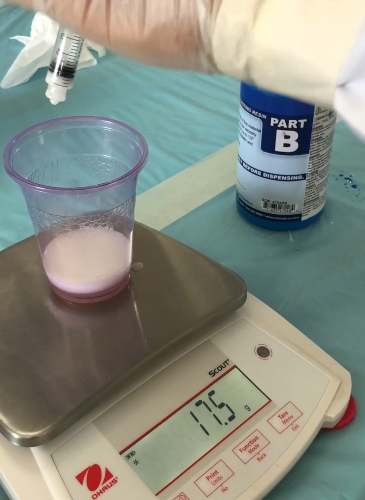 The weighted the resin using the balance scale by resetting the balance once I placed the previous amount of resin and now the amount for Part B is 17.7 grams.