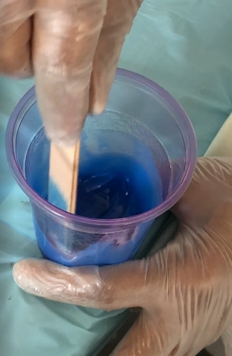 Now I mixed the two parts of resin together for 30 seconds and colored it the color blue. Then I put the mixture in another cup and mixed it for 30 seconds again using a timer.