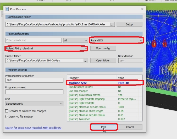Now we need to prepare the file so that we can import into the machine. First step is to right click on “Adaptive” and then click on “Post Process”. This small window will appear and now we have to input the settings we want to match the machine that we will use. I clicked on “All vendors” and chose “Roland DG” and then I clicked on “value” and chose “MDX-40” and the red boxes below show where I made my changes at. After it I clicked on “Post” and saved the file on my Desktop and repeated the same process from “Parallel”.