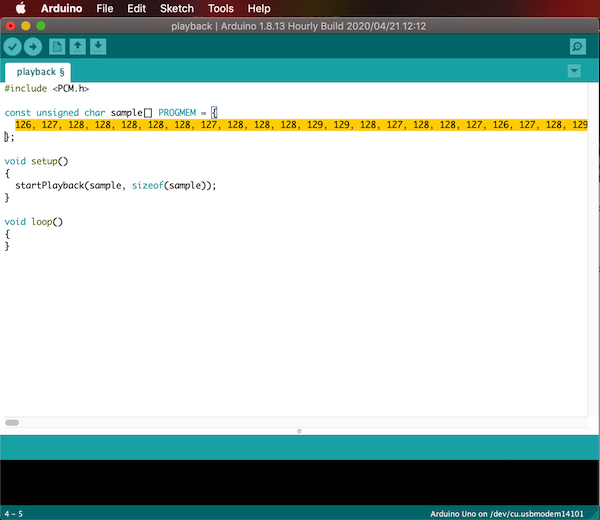 Arduino software. From File > Examples > PCM, I opened the playback example, with the board connected. I Uploaded the example to Arduino board, and it played “Arduino Duemilanove”.