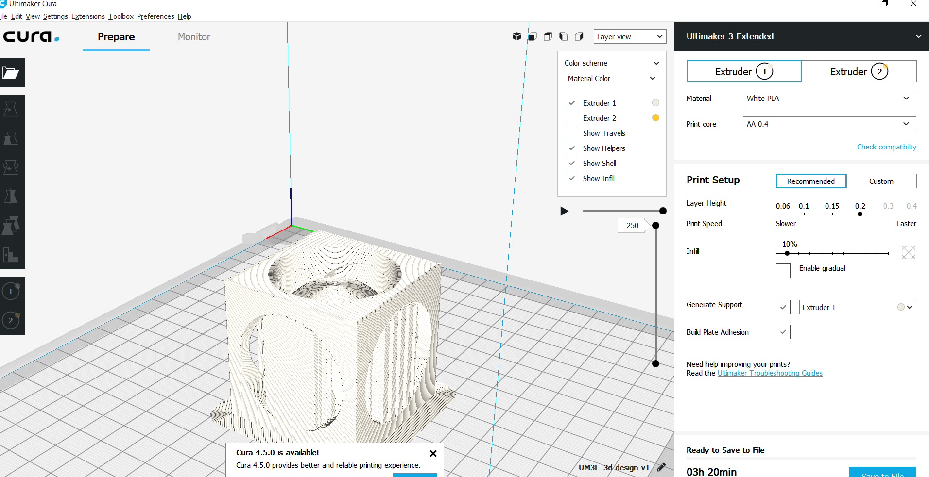 the job will take almost 3 hours and 20 mins the model to be printed.