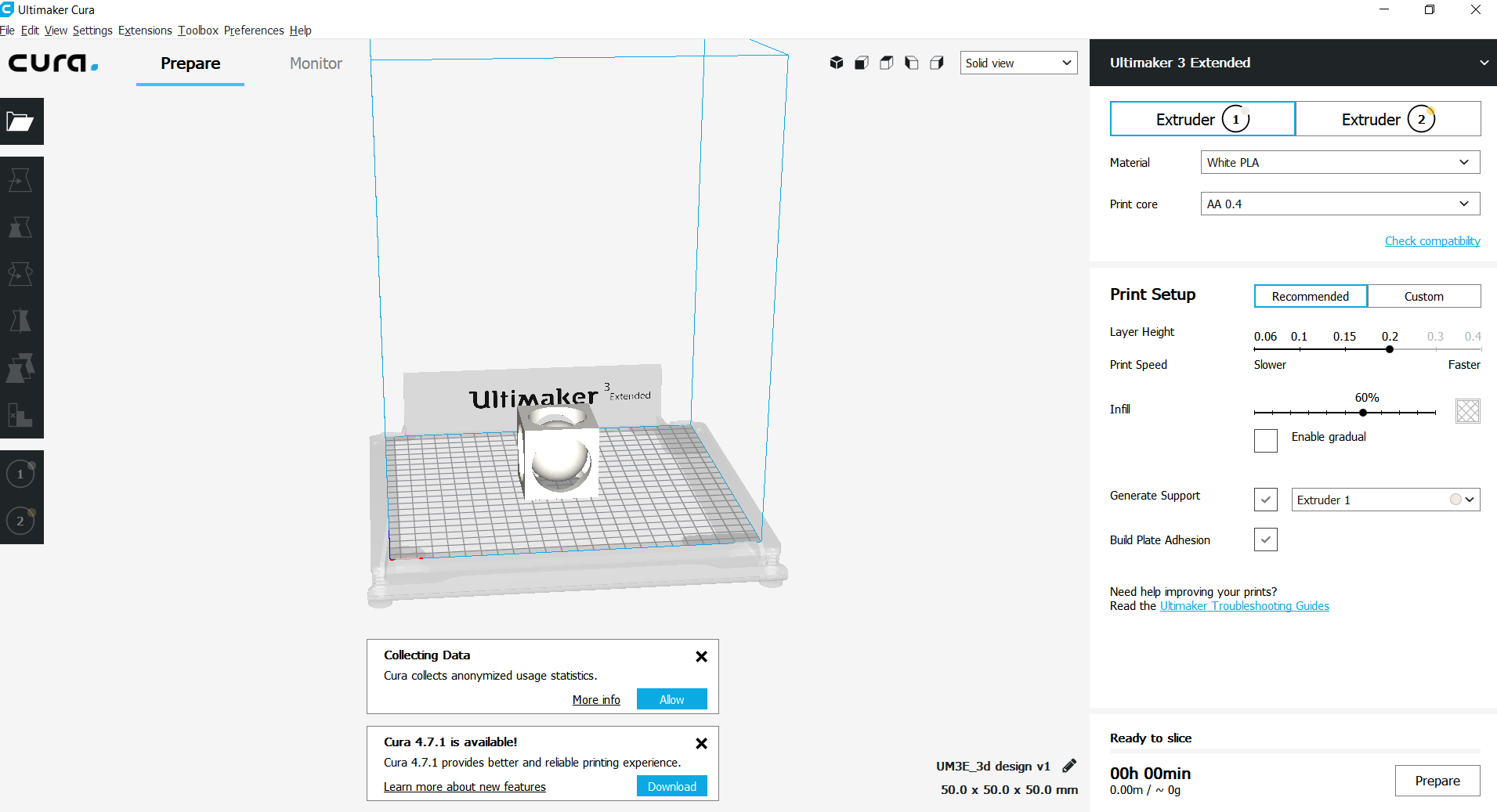 choosing ultimaker 3 extended as my printer, enabling support because I have over hanged shapes , and the brim to help in bed adhesion and to prevent warping and stabilize the model while printing, also I chose 0.4 nozzle, and because the model does not have fine details and the print is only for test experimental purposes and the strength of the model is not a big concern I chose 10% infill to reduce material consumption and time with 0.2 layers height.