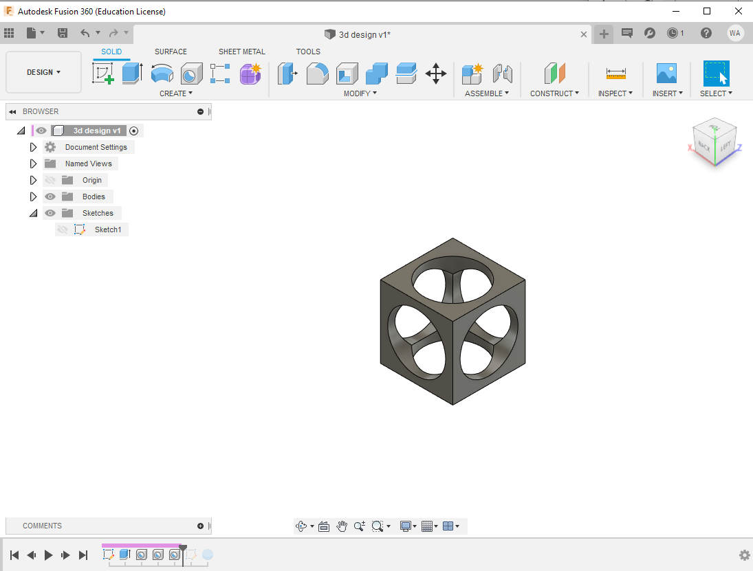 then using the hole function, I created the cylindrical holes through the 6 faces of the cube,