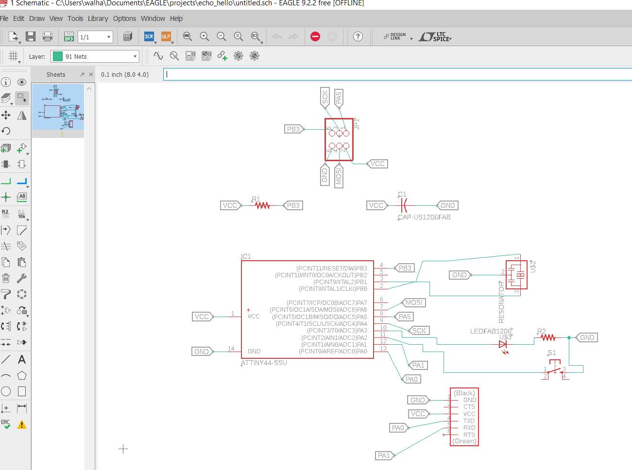 I placed the components just as Our instructor Hashim taught us with the connector having its VCC side on the right and the GND on the Left and used tags to connect the components together instead of using direct links, hence it would be easier to modify later, and much more comfortable on the eye.