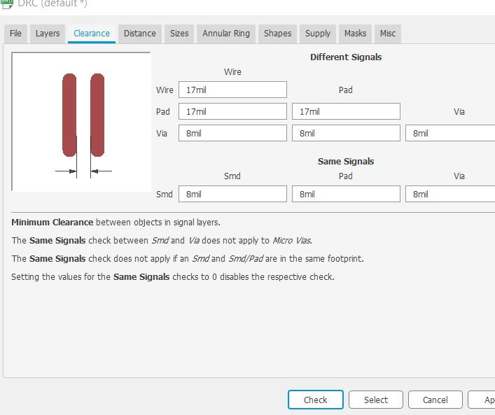 To start with board design go to the tab Generate/switch to board. Then I changed the DRC settings so that the clearance setting is as shown in the picture below,