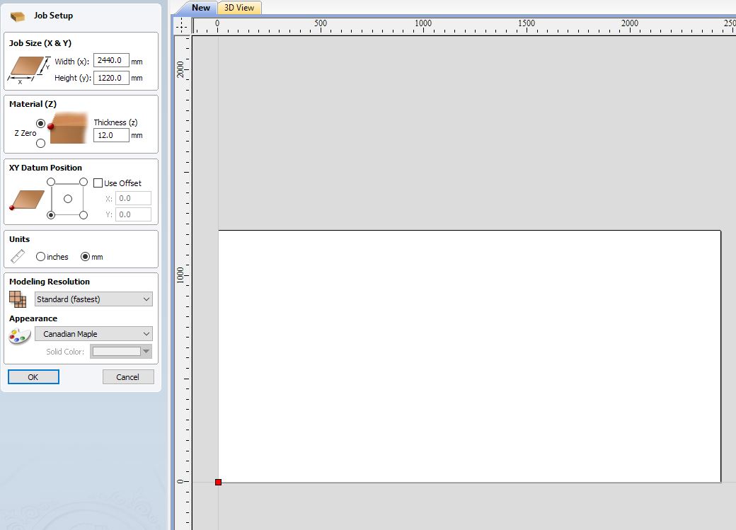 To create the toolpath I needed to import the dxf files in V Carve, then in the job Setup I have to set the sheet size and the origin of the machine as shown the picture below