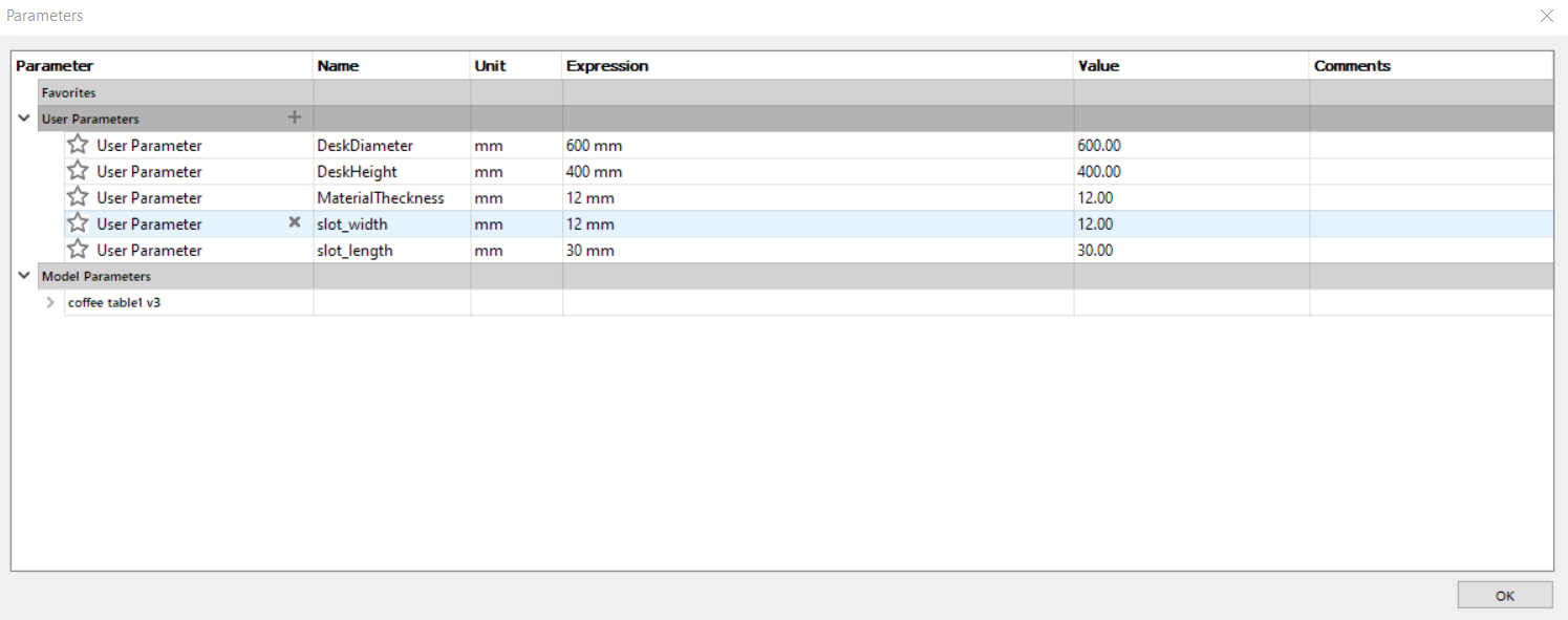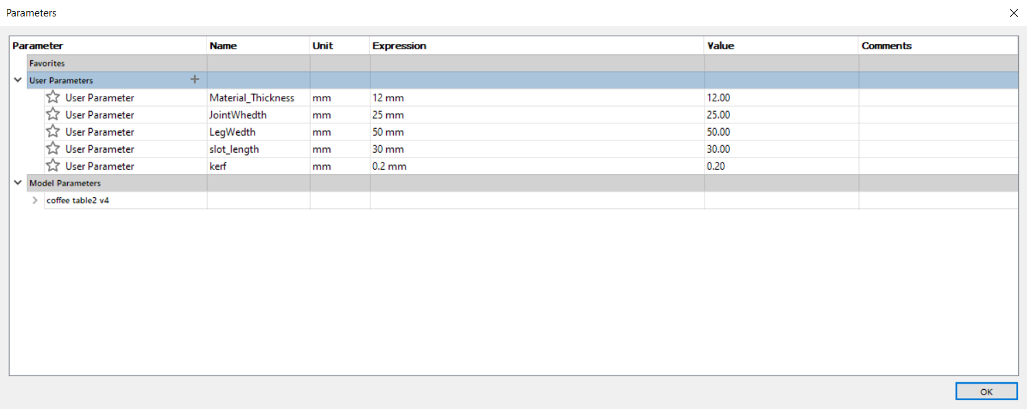 I started creating my own design, by implementing what I have learned in the design week, making sure to design a parametric table so that it be easily resized based on the sheet and material thickness and size, the parameters were as follow: