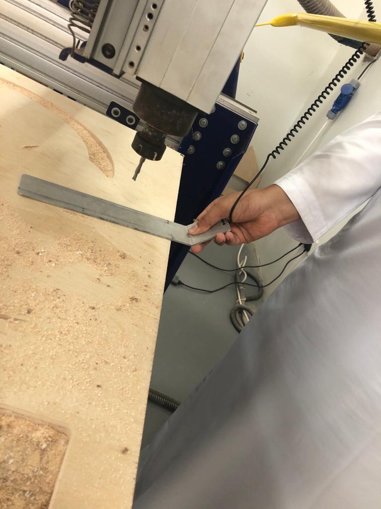 Now it is time to cut the design with real machine which is the shopbot, but before that we had to take the safety measures in to consideration, making sure of wearing the Safety glasses, masks and the safety headphone, also to keep a safe distance from the machine while it is operating.