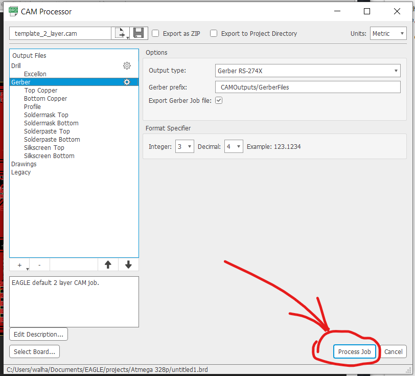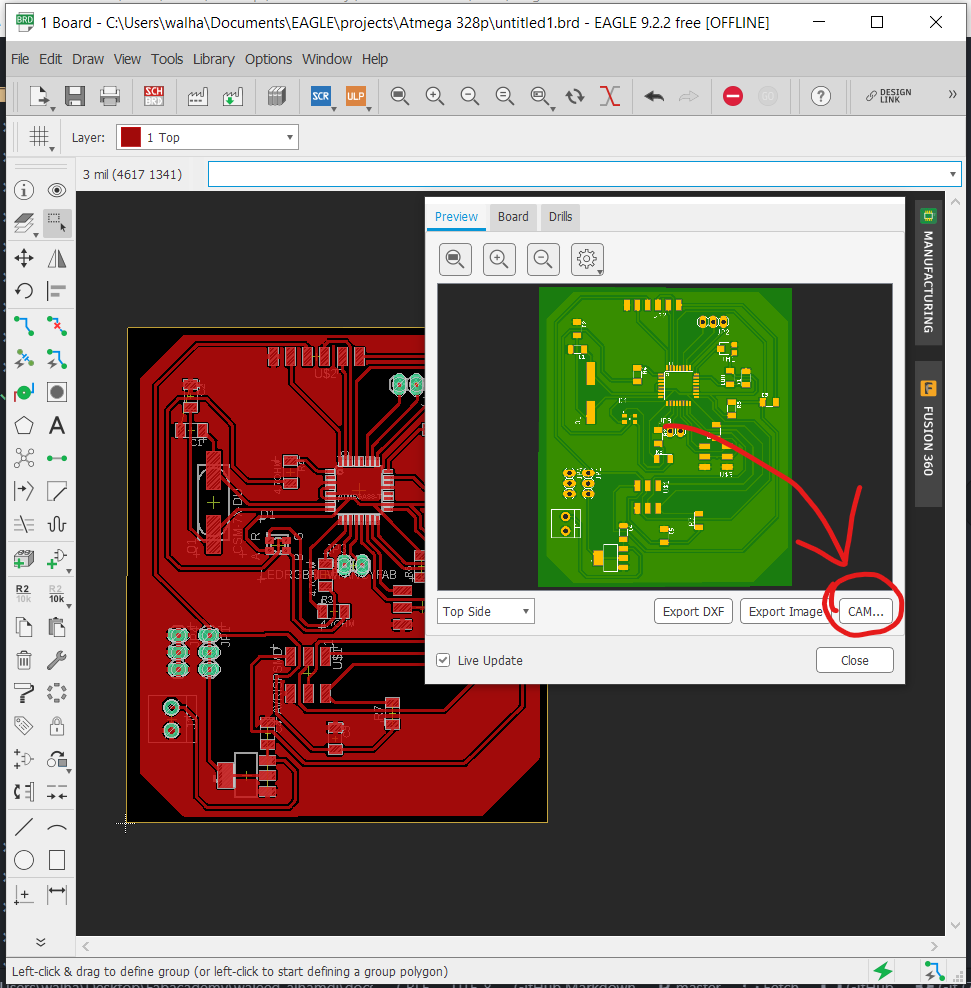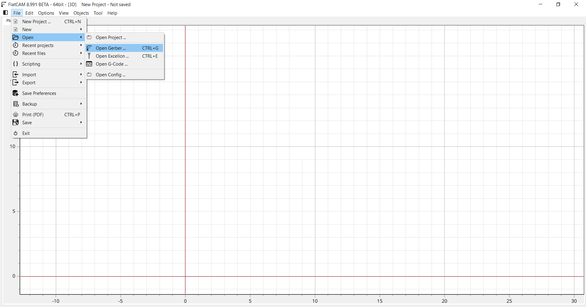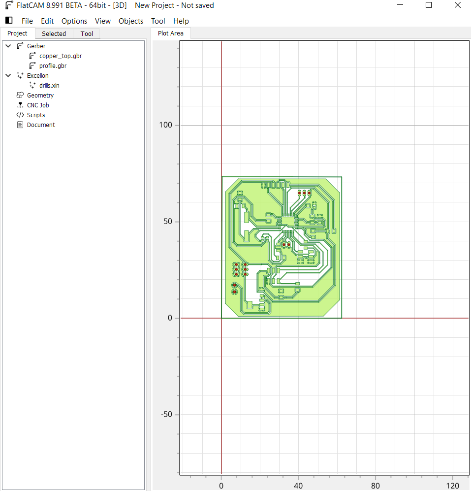 then I just launched flatcan and opened the gerber files that was created for the traces and outlines, and opened the Excellon files for the drills,