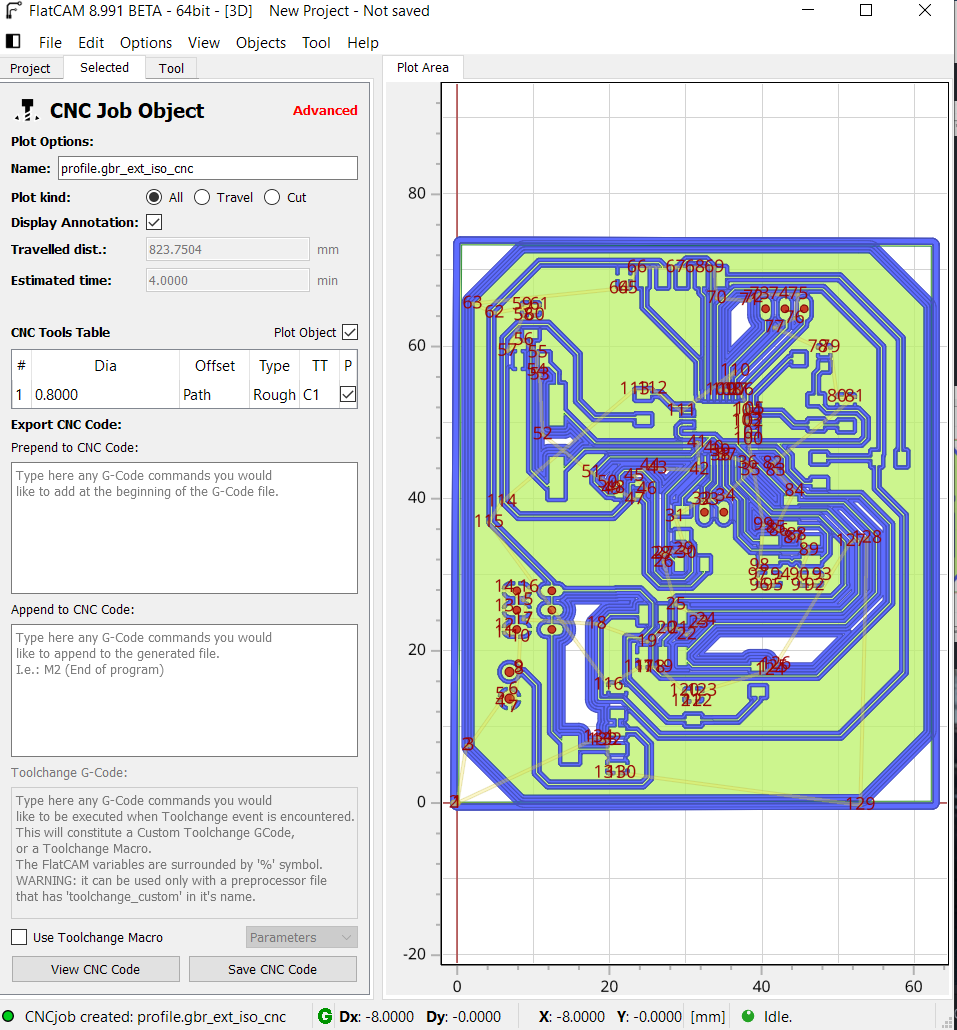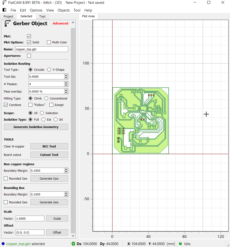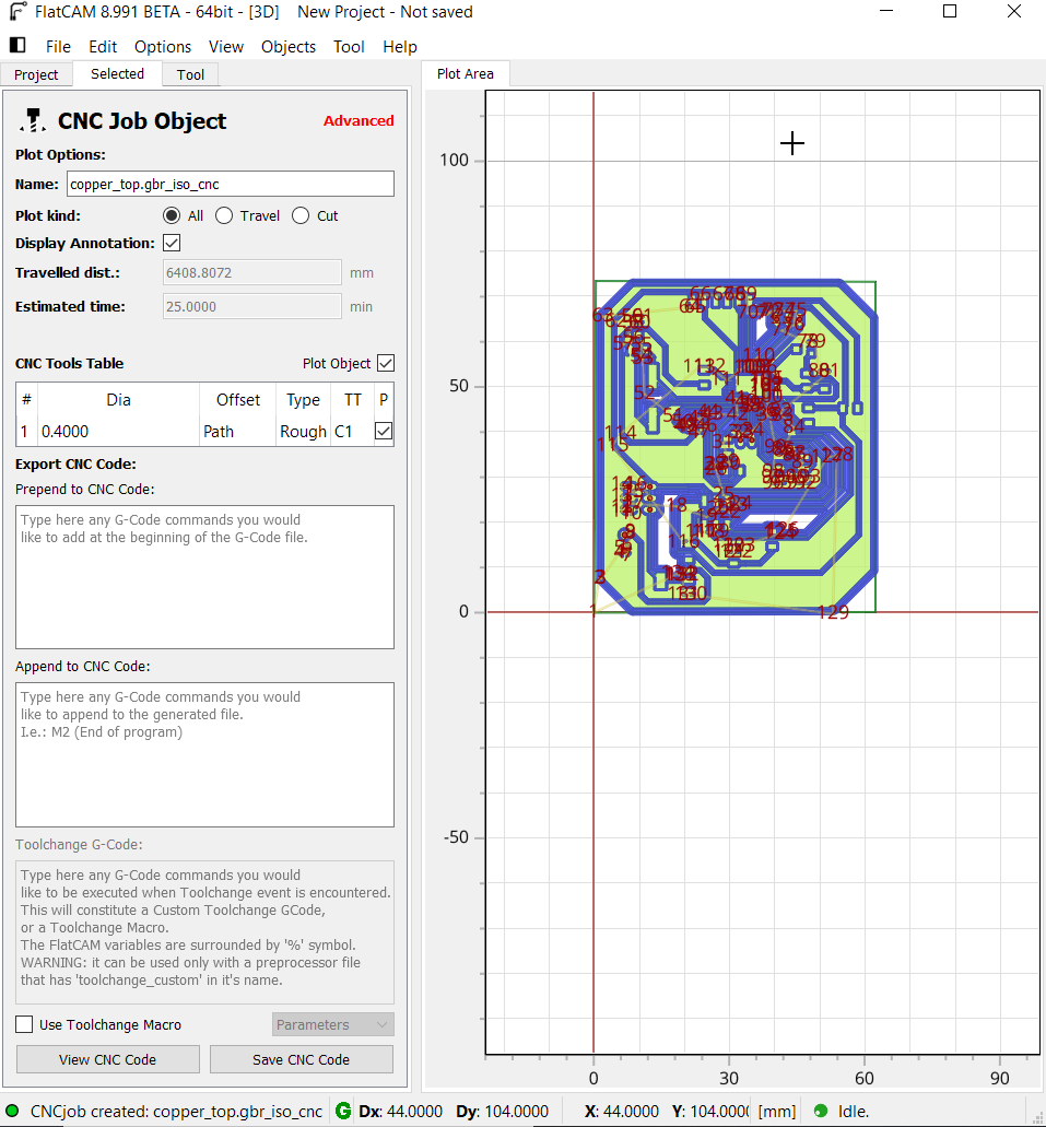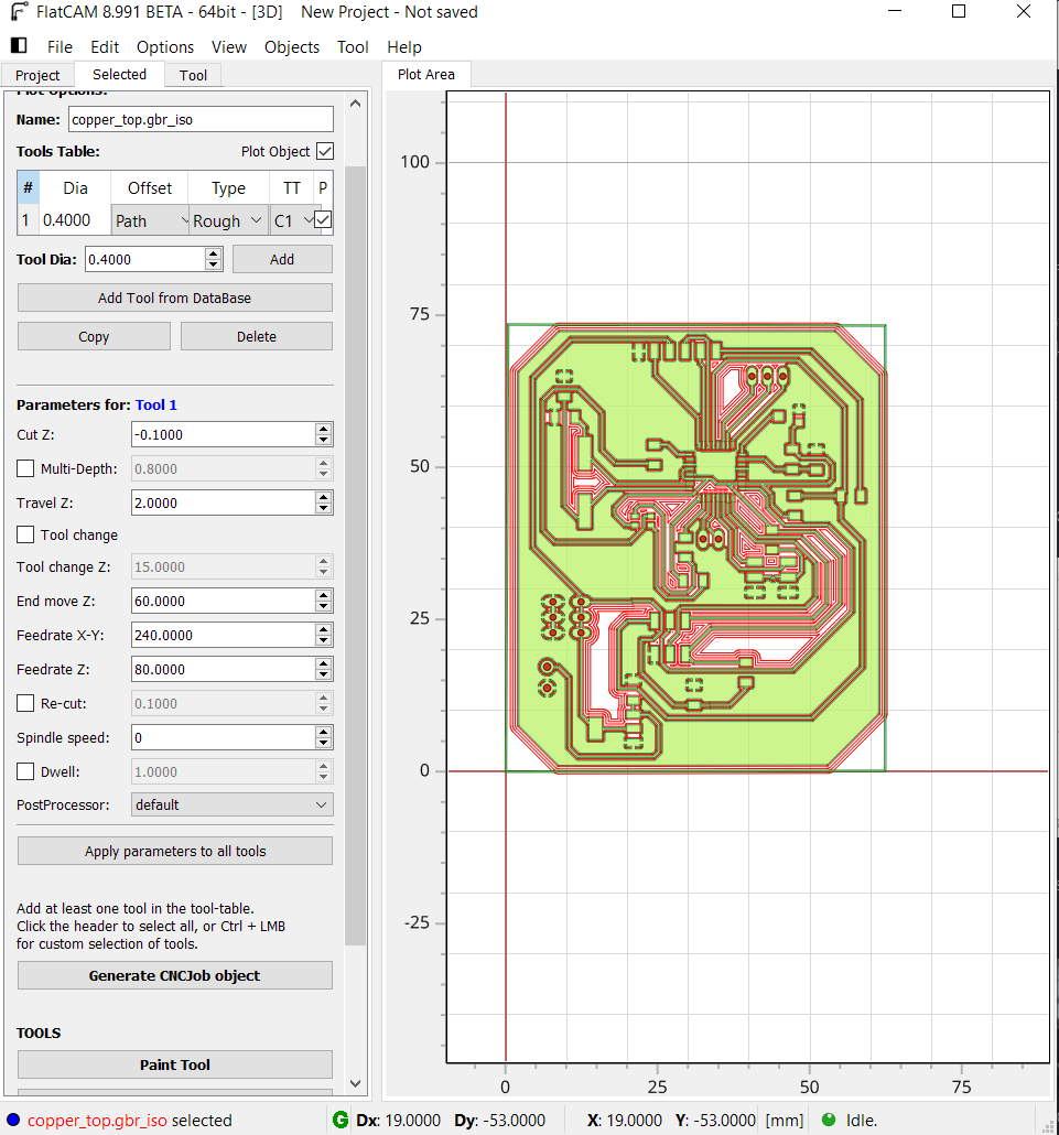 2- generate the CNC object files for traces with the following settings: Z= -0.1mm, End move Z= 60, Feedrate X-Y= 240, feedrate Z= 80,