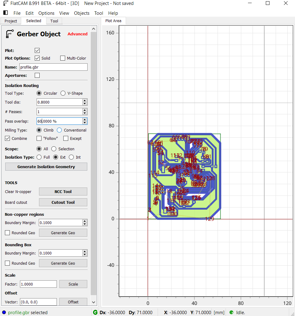 1 - generate Isolation geometry: - tool diameter= 0.8mm - number of passes= 1. - passes overlaps= 60%. - check the combine and the external isolation check boxes.