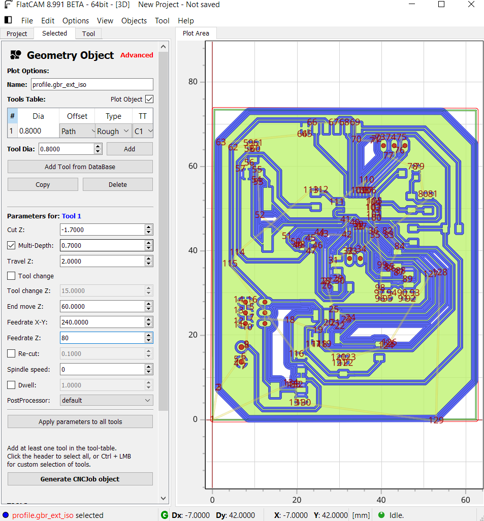 2- generate the CNC object files for traces with the following settings: Z= -1.7mm, check multi-depth= 0.7, End move Z= 60, Feedrate X-Y= 240, feedrate Z= 80,