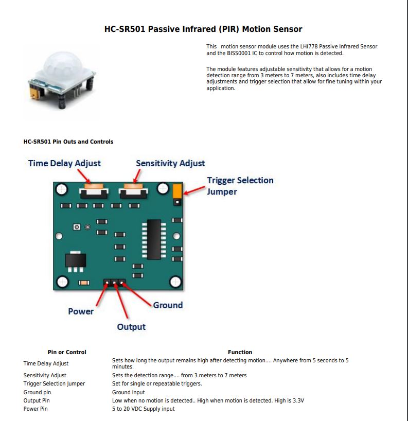 To start with, I have to go through the data sheet, to get myself familiar on how the motion sensor works, to know what the operation power is and the pinout, I referred to the following link for the data sheet and the PIR sensor model number I’m using is HC-SR501,