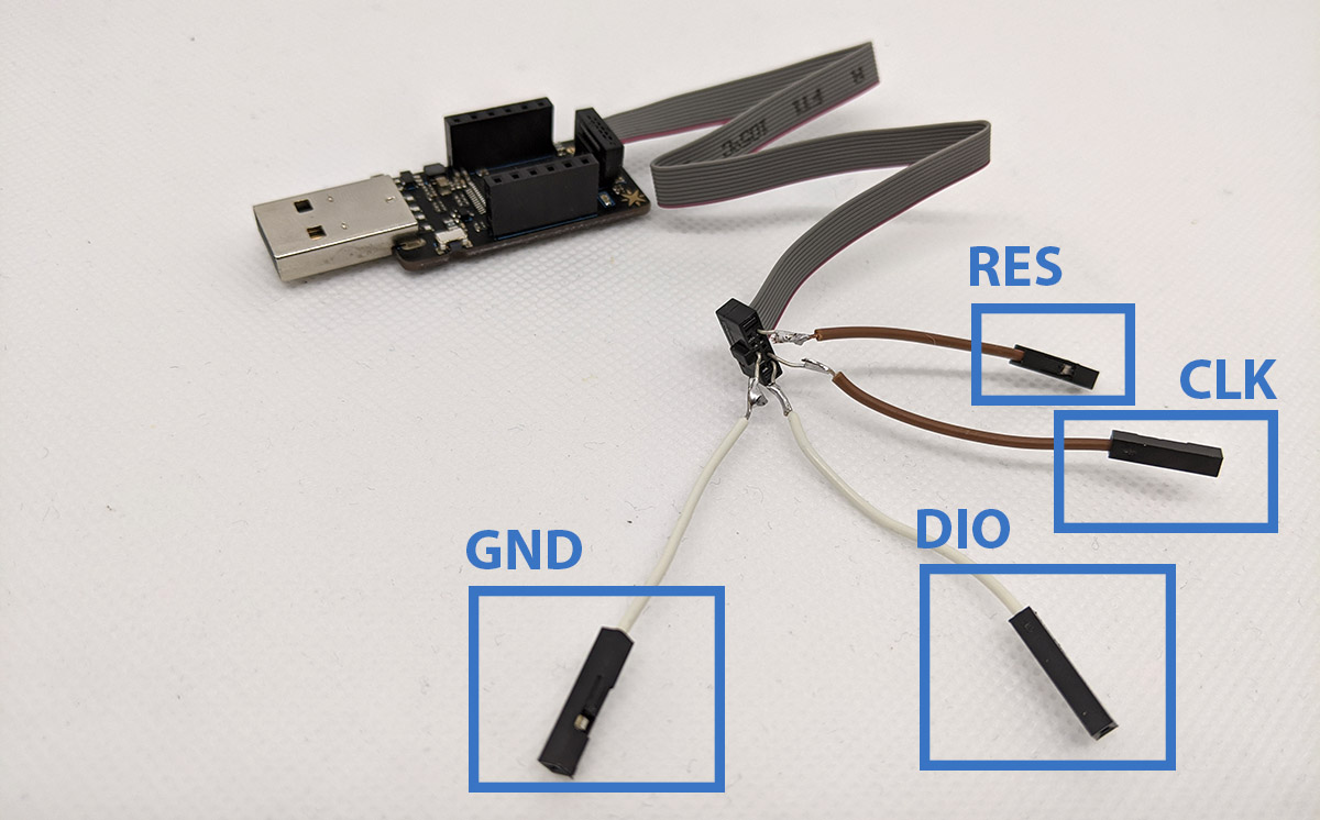 For programming the board, I start by downlading the sam_ba_Generic_D11C14A_SAMD11C14A.bin bootloader, as well as edbg to load the binary on the board. When programming the D11C, you have to find a way to connect a JTAG programmer to the 2x2 pin conenctor on the pcb. As the JTAG programmer I have here only supports 1.27mm pitch connectors, I insert individual wires: