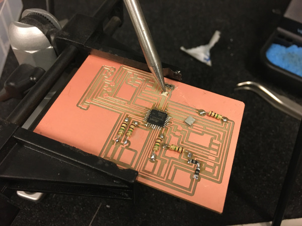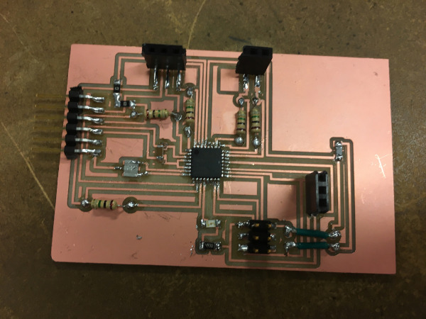 After designing the board in Eagle (see "My Final Project Work Files" in My Workfiles) ) I milled the board in the Roland MDX-40.