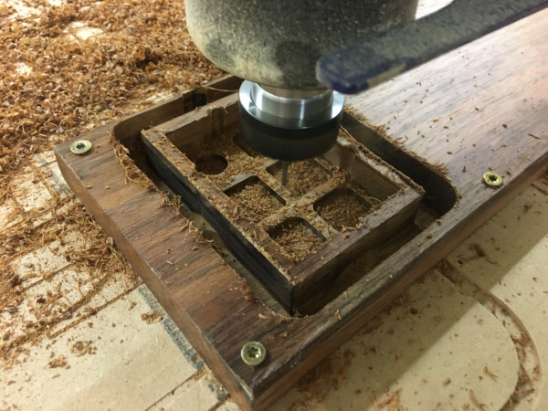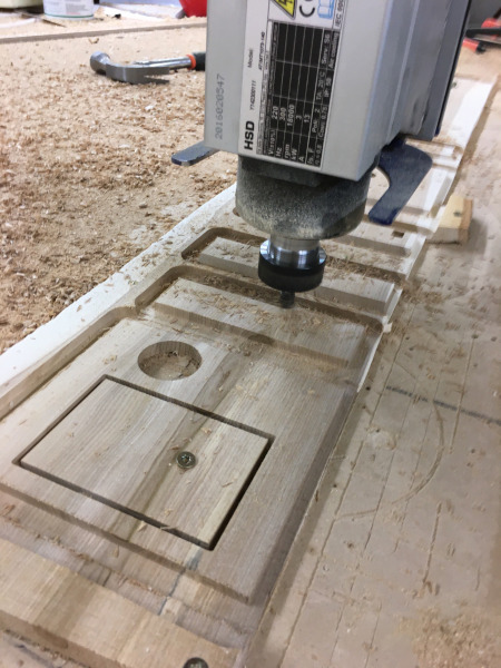 I had to use 3 different routerbits and different setups for the milling, clearing out material, cutting with a V-bit and cutting holes with a straight bit.