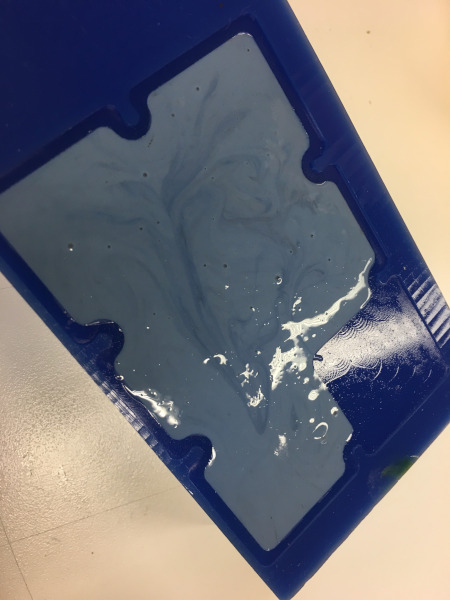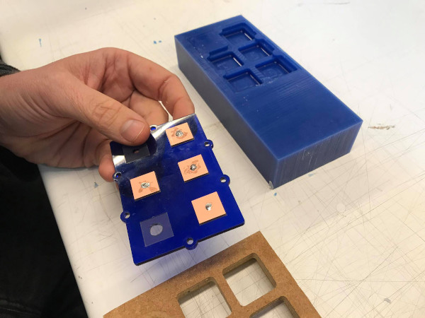 In the laser cutter I made a plate out of plexy for the the silicone pads to sit on. The plexy has holes in it for the pins on the sensors. I glued the sensors on the plexyplate and layed the whole thing down on the wet silicon.