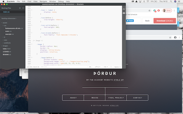 I used website development program called "Brackets". I put the template I chose called Dimension into Brackets and customised it to my liking. Brackets is a text editor for web development designed for coding in html and css.