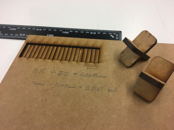 By making 20 cuts the material loss was only 0.15 mm, which is just 0.0075 mm per cut. So I went back to my design in Inkscape and made adjustments according to my results from the test and did another laser cut. By changing the joining slots from 4mm to 3.9925mm the two pieces were now a tight fit.
