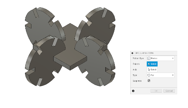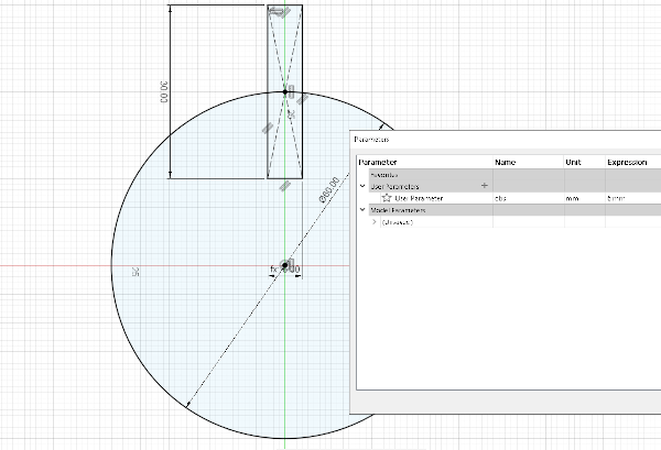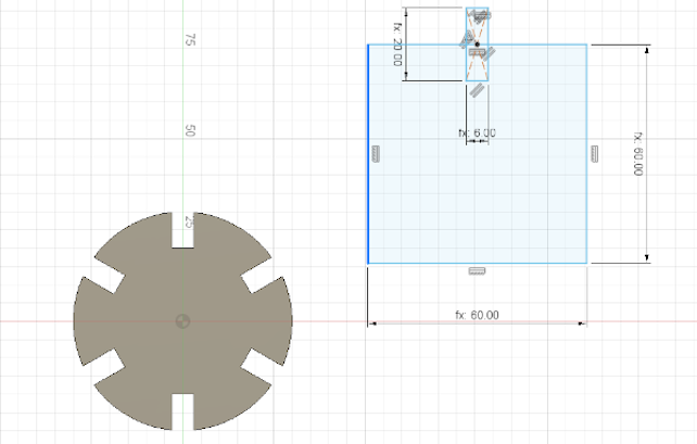 This was my first time using parameters in a design in Fusion360. So I stared by drawing a circle, setting parameters for material thickness and then using that parametric value for the joining slots. I used circular pattern to make slots all around the circle and then I drew a rectangle using the same parametrics so it could be joined to the circle.