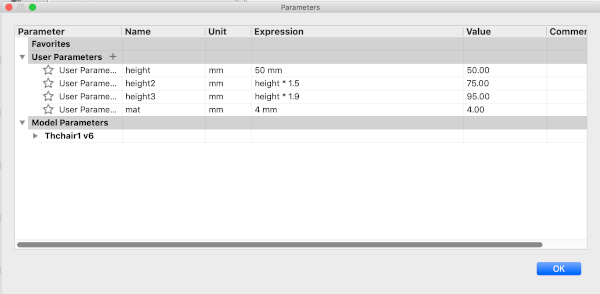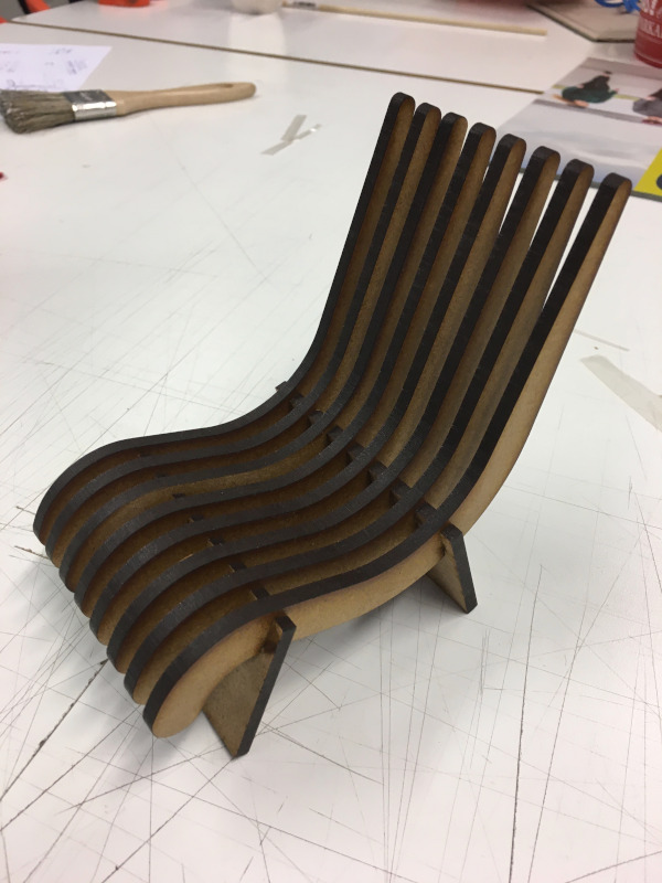 Because I had set parametric values for the measurements now I could change the value and scale down the chair by only changing material thickness and hight to make a small prototype in the lazer cutter.