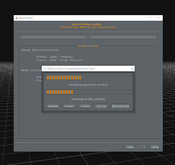 Pressed finish and went back to “workflow” and pressed “3D Model generation”, chose “high details” in both “dense point cloud” and “surface reconstruction” and pressed run.