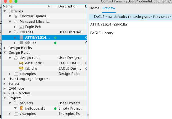 I downloaded Eagle on my computer, found the Fablab library for Eagle and imported it to the program. Then I activated the library, I could not find the ATtiny1614 in the Fab library so I found it on a website called SnapEDA and downloaded "Symbol" and "Footprint". You can find it here