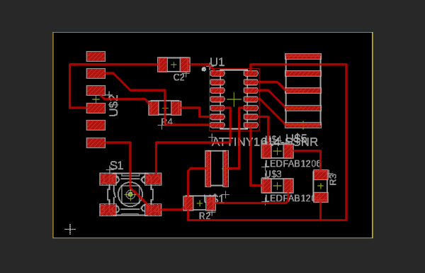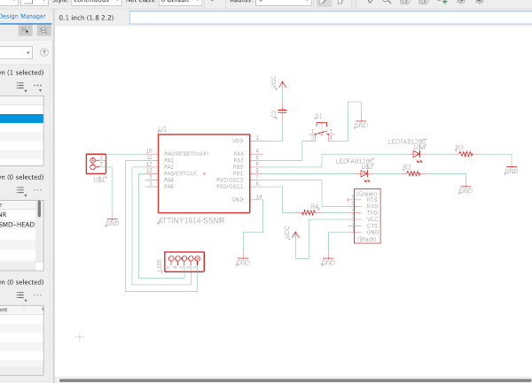 I created a new project and started my schematic. I placed the components I needed for the Helloboard1614 and added a button, two leds and two extra pins for later use. Before placing all the components and connecting them in the schematic I talked to Vilhjálmur in Fablab Höfn and he showed me how he had done that.