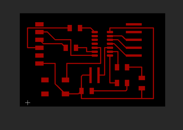 I exported the image from Eagle in high resolutionand selected "monocrome". I opened the image in "inkscape". In Inkscape I removed two of the 5 pads that were not needed for the design. Then I created the outine and exported the traces and outline seperately for milling.