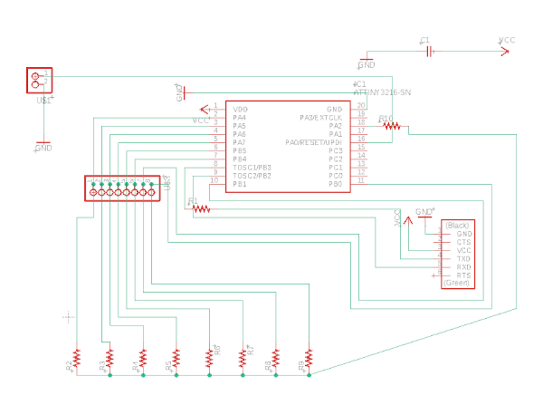 I connected the my button board to my ATtiny board and used the Arduiona Nano to program the ATtiny board to turn on it’s 2 leds when pushing the buttons on the button board. For this test I only used 2 analog pins on my ATtiny, I used analog pins 8 and 10 to read the buttons and turn on the leds through analog 6 and 7. As you can see in the video below it worked and I could make the leds go on and off using the buttons. Thanks to my instructor Jón Þór for the sound effects.....next step is to get the buttons to give us some sound.