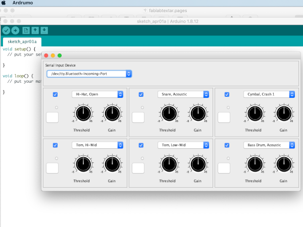 I downloaded the Ardruno Virtual Midi Interface for my MacBook. Ardruno is designed to accept serial data from the Arduino Uno board and convert it into midi drum data for the Mac.