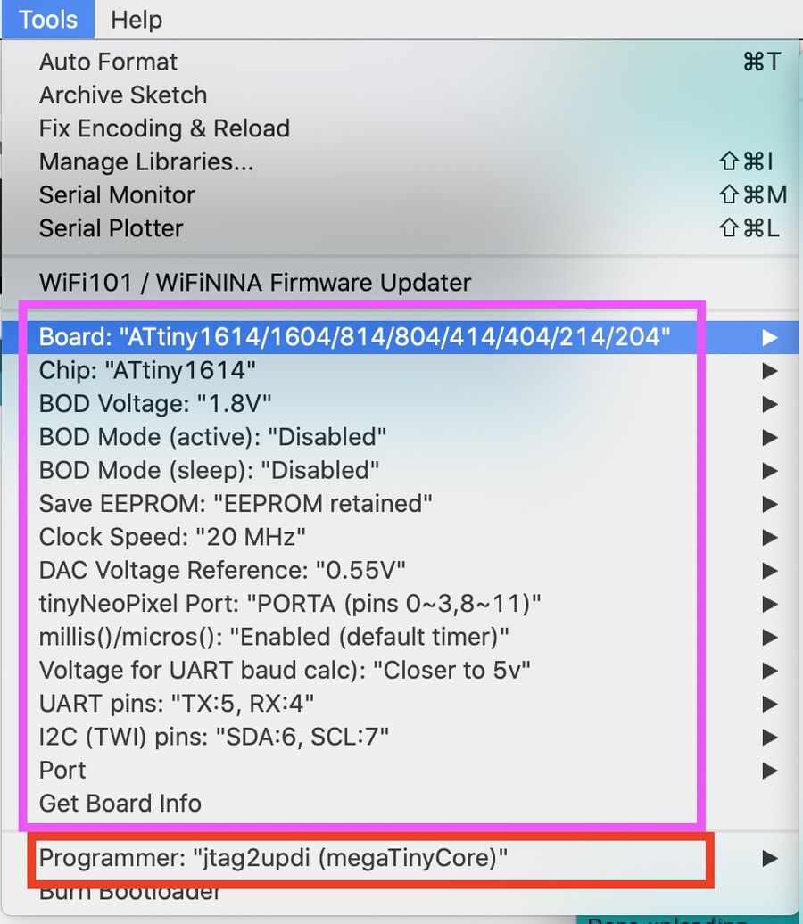Ready the code that you want to upload to the ATtiny, and change the settings. I selected the ATtiny1614 board and set the rest of the settings as they were except for the Programmer. Change Programmer to jtag2updi(megatinyCore) and then you're good to go