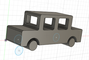 Using construction planes. I changed the “flintstone-car” wheel into 4 wheels. First I created two offset planes 10 mm from the left and right side of the car. Then I drew a circle wider then the cylinder and extruded the cylinder from one plane to the other.